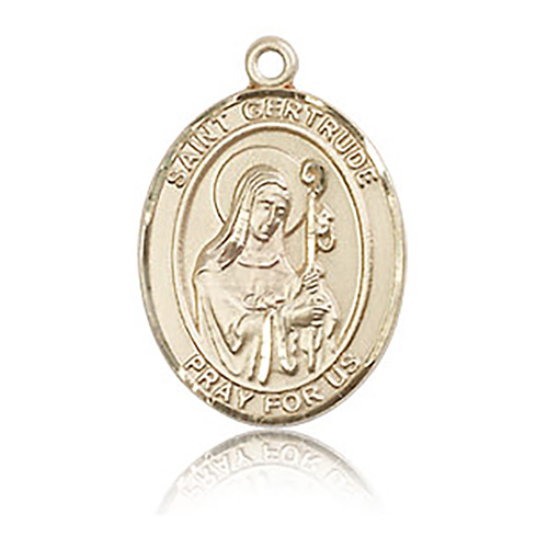 This ladies' 14k yellow gold St Gertrude medal is die struck and hand-engraved. Inscription: SAINT GERTRUDE PRAY FOR US. Dimensions: 3/4in x 1/2in. This item is the size of a penny. Made in USA.