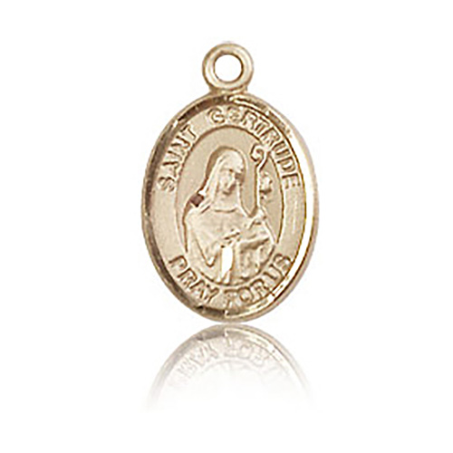 This very small St. Gertrude medal is made of solid 14k yellow gold. Inscription: SAINT GERTRUDE PRAY FOR US. Dimensions: 1/2in x 1/4in. This item is half the height of a quarter. Made in USA.