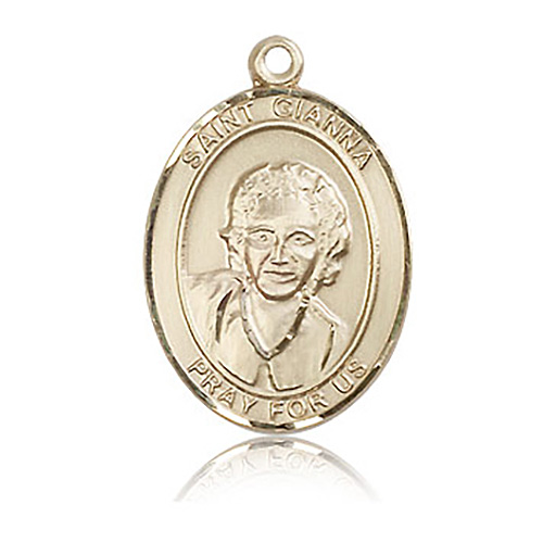 Die struck, hand-engraved St Gianna medal is made of polished, solid 14k yellow gold. Inscription: SAINT GIANNA PRAY FOR US. Dimensions: 1in x 3/4in. This item is the size of a quarter. Made in USA.