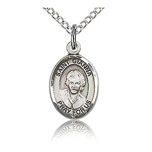 This small sterling silver St Gianna charm dangles from a sterling silver 18in lite curb chain with lobster clasp. Plain back. Dimensions: 1/2in x 1/4in. This item is half the height of a quarter. Die struck, hand-engraved. SAINT GIANNA PRAY FOR US. Made in USA.