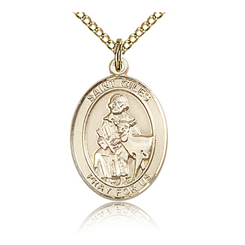 Oval St. Giles die struck, hand-engraved medal. Inscription: SAINT GILES PRAY FOR US. 18-inch gold-plated sterling silver lite curb chain has a lobster clasp. Dimensions: 3/4in x 1/2in. This item is the size of a penny. Made in USA.
