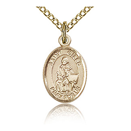 Die struck, hand-engraved St Giles charm is made of gold filled sterling silver. 18-inch gold plated, sterling silver lite curb chain has a lobster clasp. Plain back. Dimensions: 1/2in x 1/4in. This item is half the size of a quarter. Made in USA.