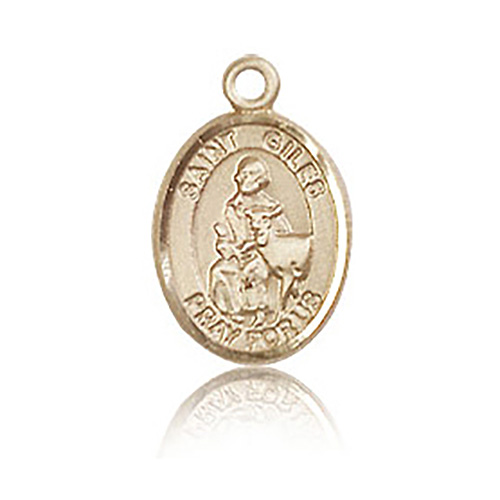 St. Giles medal is made of solid 14k yellow gold. Inscription: SAINT GILES PRAY FOR US. Dimensions: 1/2in x 1/4in. This item is half the height of a quarter. Die struck, hand-engraved. Made in USA.