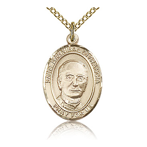 St. Hannibal die struck, hand-engraved medal. Inscription: SAINT HANNIBAL PRAY FOR US. 18-inch gold-plated sterling silver lite curb chain has a lobster clasp. Dimensions: 3/4in x 1/2in. This item is the size of a penny. Made in USA.