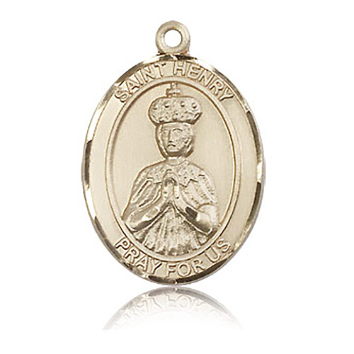 Die struck, hand-engraved medal is made of polished, solid 14kt yellow gold. Inscription: SAINT HENRY PRAY FOR US. Dimensions: 1in x 3/4in. This item is the size of a quarter. Made in USA.