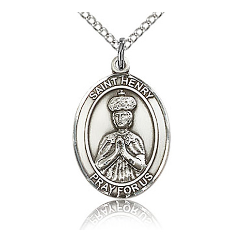Sterling silver oval St Henry medal dangles from a sterling silver 18-inch lite curb chain with lobster clasp. Item size: 3/4in x 1/2in. This item is the size of a penny. Inscription: SAINT HENRY PRAY FOR US. Die struck, hand-engraved medal. Made in USA.
