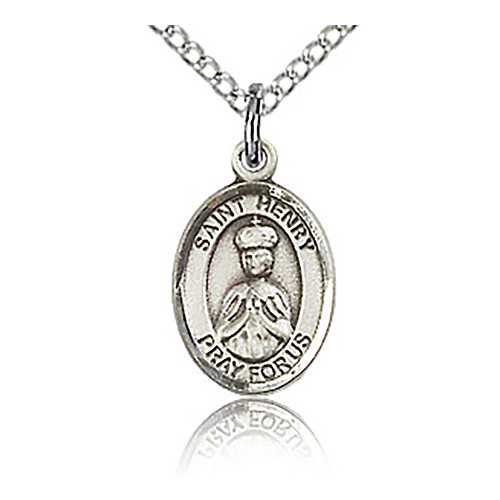 Die struck, hand-engraved St Henry charm. 18-inch sterling silver lite curb chain with lobster clasp. Plain back. Dimensions: 1/2in x 1/4in. This item is half the size of a quarter. Made in USA.