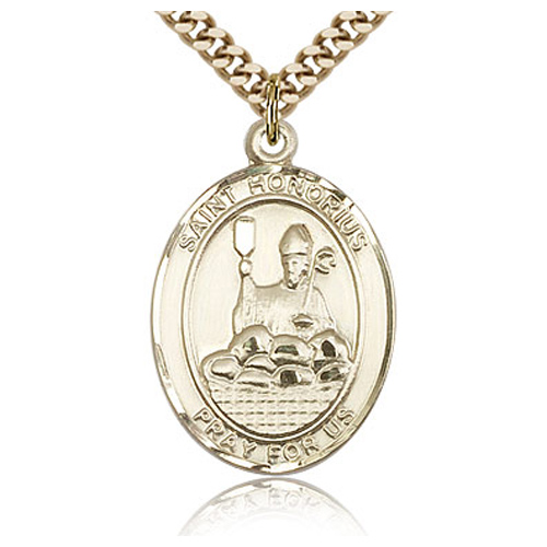 Gold filled sterling silver oval St Honorius medal dangles from a 24-inch stainless steel, endless heavy curb chain with gold plating. Die struck, hand-engraved. Inscription: SAINT HONORIUS PRAY FOR US. Dimensions: 1in x 3/4in. This item is the size of a quarter. Made in USA.