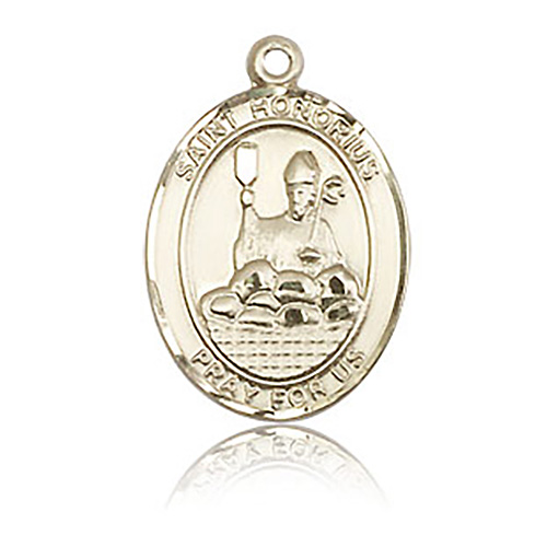 Die struck, hand-engraved St. Honorius medal is made of polished, solid 14k yellow gold. Inscription: SAINT HONORIUS PRAY FOR US. Dimensions: 3/4in x 1/2in. This item is the size of a penny. Made in USA.