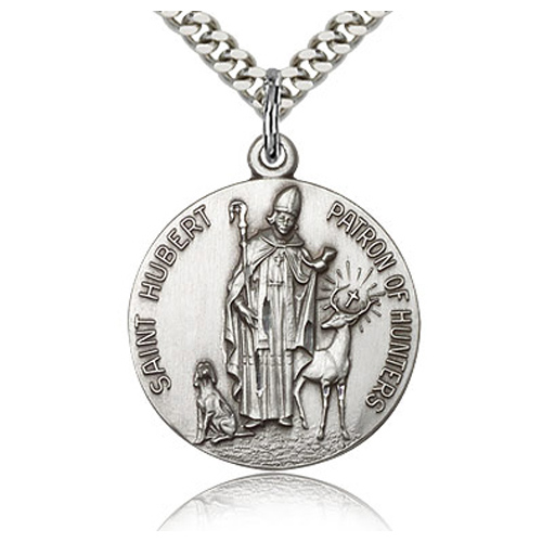 Die struck, round St Hubert medal is made of polished sterling silver. 7/8in x 7/8in. Inscription: SAINT HUBERT PATRON OF HUNTERS. 24-inch stainless steel, endless heavy curb chain with silver plating. This medal is the size of a nickel. Made in USA.