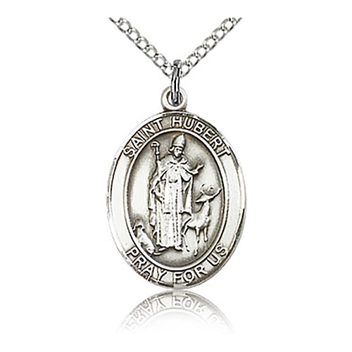 Sterling silver oval St Hubert medal and sterling silver 18in lite curb chain with lobster clasp. Medal size: 3/4in x 1/2in. This item is the size of a penny. Inscription: SAINT HUBERT PRAY FOR US. Die struck, hand-engraved. Made in USA.