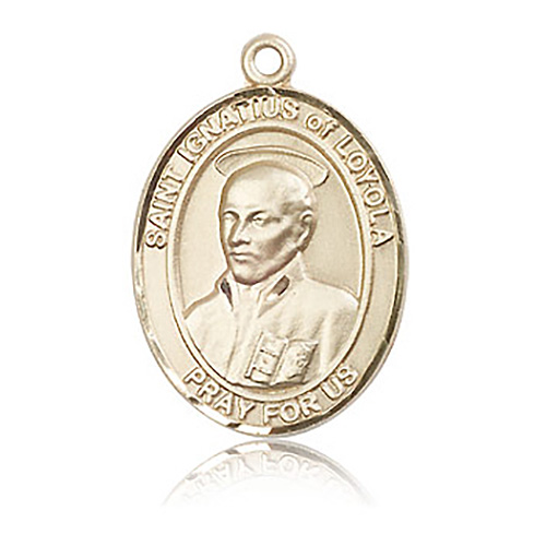 Die struck, hand-engraved medal is made of polished, solid 14kt yellow gold. Inscription: SAINT IGNATIUS OF LOYOLA PRAY FOR US. Dimensions: 1in x 3/4in. This item is the size of a quarter. Made in USA.