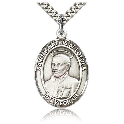 Sterling silver St Ignatius medal is die struck and hand-engraved. Dimensions: 1in x 3/4in. Inscription: SAINT IGNATIUS OF LOYOLA PRAY FOR US. 24-inch stainless steel, endless heavy curb chain with silver plating. This item is the size of a quarter. Made in USA.