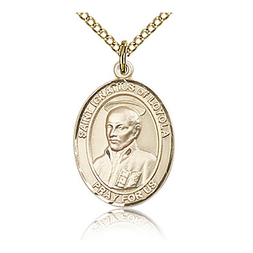 Die struck, hand-engraved medal. Inscription: SAINT IGNATIUS OF LOYOLA PRAY FOR US. Gold-plated sterling silver 18in lite curb chain with lobster clasp. Dimensions: 3/4in x 1/2in. This item is the size of a penny. Made in USA.