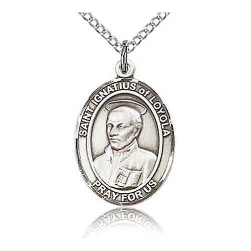 Sterling silver oval St Ignatius medal dangles from an 18-inch sterling silver lite curb chain with lobster clasp. Dimensions: 3/4in x 1/2in. This item is the size of a penny. Die struck, hand-engraved medal. Inscription: SAINT IGNATIUS OF LOYOLA PRAY FOR US. Made in USA.