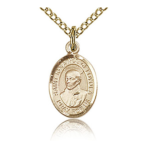 This very small St Ignatius of Loyola charm is made of gold filled sterling silver. Gold plated, sterling silver 18-inch slender curb chain with lobster clasp. Plain back. Dimensions: 1/2in x 1/4in. This item is half the size of a quarter. Die struck, hand-engraved. Made in USA.