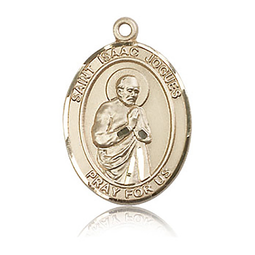 Die struck, hand-engraved St Isaac medal is made of polished, solid 14k yellow gold. Inscription: SAINT ISAAC JOGUES PRAY FOR US. Dimensions: 1in x 3/4in. This item is the size of a quarter. Made in USA.