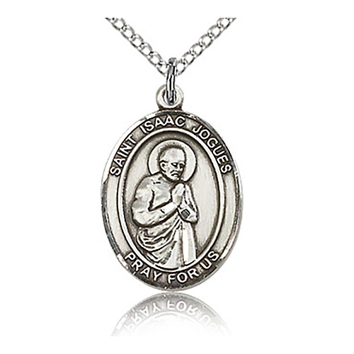 This sterling silver die struck St. Isaac medal is hand-engraved. Inscription: SAINT ISAAC JOGUES PRAY FOR US. 18-inch sterling silver lite curb chain has a lobster clasp. Dimensions: 3/4in x 1/2in. This item is the size of a penny. Made in USA.