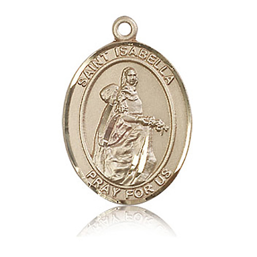 Die struck, hand-engraved St Isabella medal is made of polished, solid 14kt yellow gold. Inscription: SAINT ISABELLA PRAY FOR US. Dimensions: 1in x 3/4in. This item is the size of a quarter. Made in USA.
