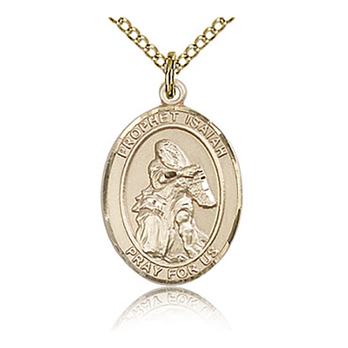 This St. Isaiah medal is die struck and hand-engraved. Inscription: SAINT ISAIAH PRAY FOR US. Free 18-inch sterling silver lite curb chain with lobster clasp. Dimensions: 3/4in x 1/2in. This item is the size of a penny. Made in USA.