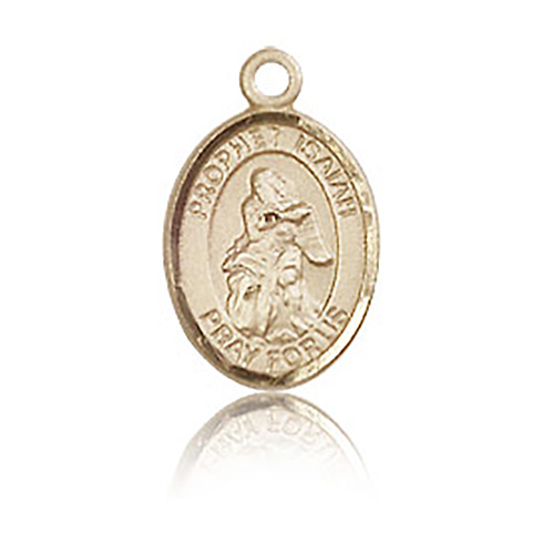 This very small St Isaiah medal is made of polished, solid 14kt yellow gold. Inscription: SAINT ISAIAH PRAY FOR US. Dimensions: 1/2in x 1/4in. This item is half the size of a quarter. Die struck, hand-engraved. Made in USA.
