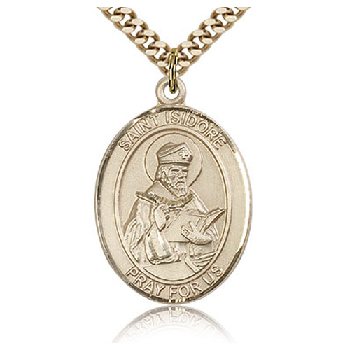 Gold filled St Isidore medal dangles from a 24-inch stainless steel, endless heavy curb chain with gold plating. Dimensions: 1in x 3/4in. This item is the size of a quarter. Inscription: SAINT ISIDORE PRAY FOR US. Die struck, hand-engraved. Made in USA.