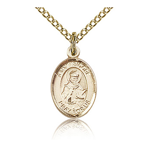Die struck, hand-engraved St Isidore of Seville charm is made of gold filled sterling sliver. 18-inch gold plated, sterling silver lite curb chain with lobster clasp. Plain back. Dimensions: 1/2in x 1/4in. This item is half the size of a quarter. Made in USA.
