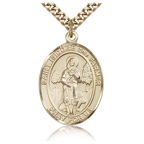 Gold filled sterling silver St Isidore the Farmer medal is die struck and hand-engraved. Inscription: SAINT ISIDORE the FARMER PRAY FOR US. Free 24-inch stainless steel, endless heavy curb chain with gold plating. Dimensions: 1in x 3/4in. This item is the size of a quarter. Made in USA.