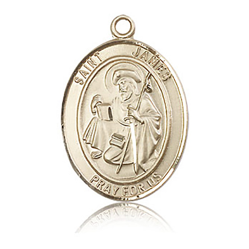 Die struck, hand-engraved St James the greater medal is made of polished, solid 14k yellow gold. Inscription: SAINT JAMES PRAY FOR US. Dimensions: 1in x 3/4in. This item is the size of a quarter. Made in USA.