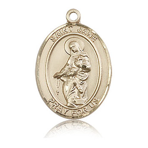 Die struck, hand-engraved medal is made of polished, solid 14kt yellow gold. Inscription: SAINT JANE PRAY FOR US. Dimensions: 1in x 3/4in. This item is the size of a quarter. Made in USA.