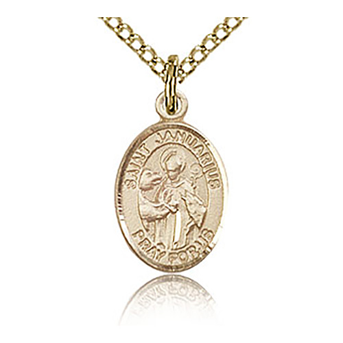 Die struck, hand-engraved gold filled sterling silver St Januarius charm is extra small. 18-inch gold plated, sterling silver lite curb chain with lobster clasp. Plain back. Dimensions: 1/2in x 1/4in. This item is half the size of a quarter. Made in USA.