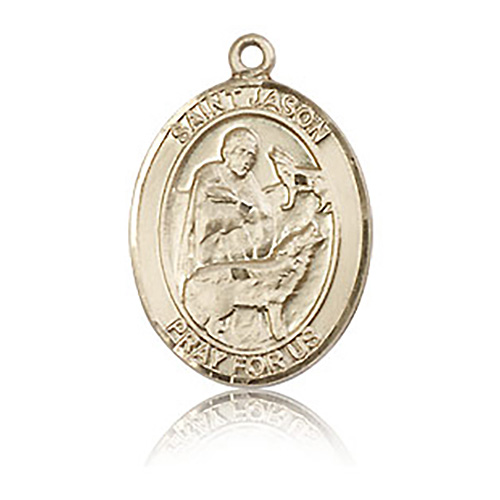 Die struck, hand-engraved medal is made of polished, solid 14kt yellow gold. Inscription: SAINT JASON PRAY FOR US. Dimensions: 3/4in x 1/2in. This item is the size of a penny. Made in USA.