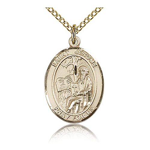 This gold-filled St. Jerome medal has a gold-plated sterling silver 18in lite curb chain with lobster clasp. Inscription: SAINT JEROME PRAY FOR US. Item size: 3/4in x 1/2in. This medal is the size of a penny. Die struck, hand-finished. Made in USA.