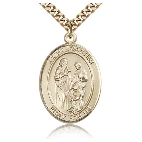 Gold filled sterling silver oval St Joachim medal dangles from a 24-inch stainless steel, endless heavy curb chain with gold plating.Die struck, hand-engraved. Inscription: SAINT JOACHIM PRAY FOR US. Dimensions: 1in x 3/4in. This item is the size of a quarter. Made in USA.
