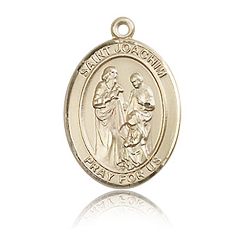 This ladies' 14k yellow gold oval St Joachim medal is die struck and hand-engraved. Inscription: SAINT JOACHIM PRAY FOR US. Dimensions: 3/4in x 1/2in. This item is the size of a penny. Made in USA.