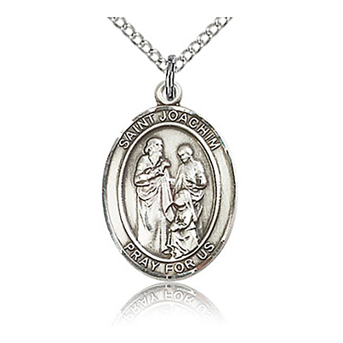 Silver St. Joachim die struck, hand-engraved medal. Inscription: SAINT JOACHIM PRAY FOR US. Free 18-inch sterling silver lite curb chain with lobster clasp. Dimensions: 3/4in x 1/2in. This item is the size of a penny. Made in USA.
