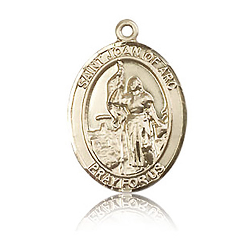 Die struck, hand-engraved medal is made of polished, solid 14kt yellow gold. Inscription: SAINT JOAN OF ARC PRAY FOR US. Dimensions: 3/4in x 1/2in. This item is the size of a penny. Made in USA.