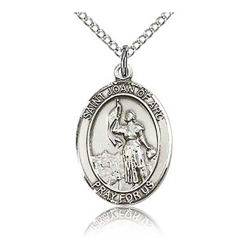 Sterling silver oval St Joan of Arc medal dangles from a sterling silver 18in lite curb chain with lobster clasp. Dimensions: 3/4in x 1/2in. This item is the size of a penny. Inscription: SAINT JOAN OF ARC PRAY FOR US. Die struck, hand-engraved medal. Made in USA.