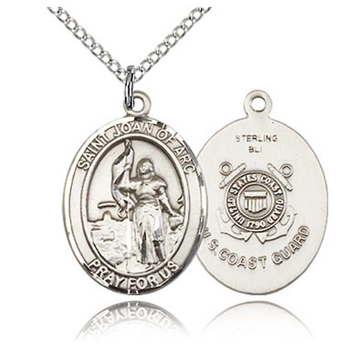 Silver Joan of Arc die struck, hand-engraved medal. Inscription: SAINT JOAN OF ARC PRAY FOR US. Free 18-inch sterling silver lite curb chain with lobster clasp. Dimensions: 3/4in x 1/2in. This item is the size of a penny. Made in USA.