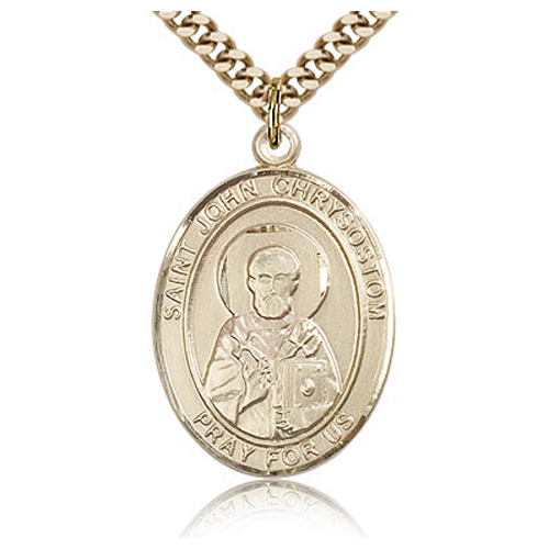 Gold filled oval St John Chrysostom medal is made for men and dangles from a 24 inch stainless steel curb chain with gold plating. No clasp. Inscription: SAINT JOHN CHRYSOSTOM PRAY FOR US. Dimensions: 1in x 3/4in. This item is the size of a quarter. Die struck, hand-engraved medal. Made in USA.