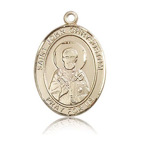 This oval St John Chrysostom medal is made of polished, solid 14k yellow gold. Inscription: SAINT JOHN CHRYSOSTOM PRAY FOR US. Dimensions: 1in x 3/4in. This item is the size of a quarter. Made in USA.