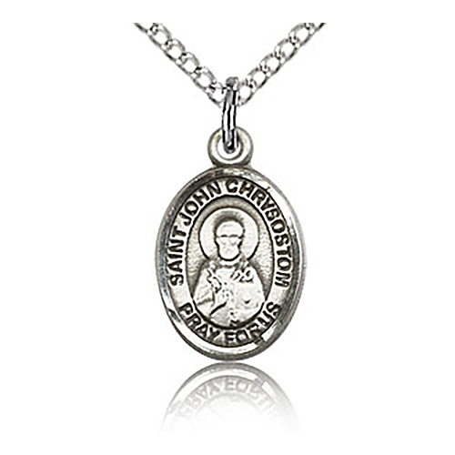 This sterling silver St John Chrysostom charm is very small. Dimensions: 1/2in x 1/4in. This item is half the size of a quarter. 18-inch sterling silver lite curb chain with lobster clasp. Plain back. Die struck, hand-engraved. Made in USA.