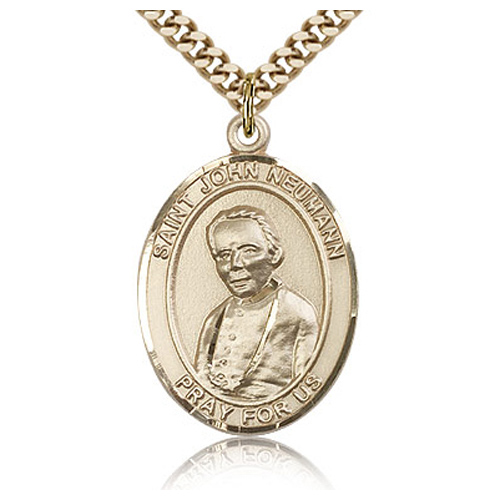 Die struck, hand-engraved medal. Inscription: SAINT JOHN NEUMANN PRAY FOR US. 24-inch stainless steel, endless heavy curb chain with gold plating. Dimensions: 1in x 3/4in. This item is the size of a quarter. Made in USA.
