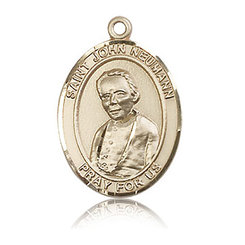 Die struck, hand-engraved medal is made of polished, solid 14kt yellow gold. Inscription: SAINT JOHN NEUMANN PRAY FOR US. Dimensions: 1in x 3/4in. This item is the size of a quarter. Made in USA.