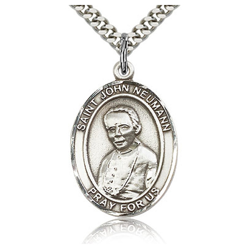 Sterling silver oval St John Neumann medal has the inscription: SAINT JOHN NEUMANN PRAY FOR US. 24-inch stainless steel, endless heavy curb chain with silver plating. Dimensions: 1in x 3/4in. This item is the size of a quarter. Die struck, hand-engraved. Made in USA.