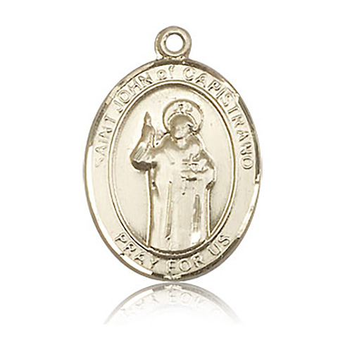 Die struck, hand-engraved St John of Capistrano medal is made of polished, solid 14k yellow gold. Inscription: SAINT JOHN of CAPISTRANO PRAY FOR US. Dimensions: 1in x 3/4in. This item is the size of a quarter. Made in USA.