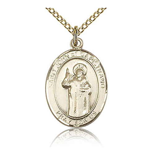 Saint John of Capistrano die struck, hand-engraved medal is made of gold filled sterling silver. Inscription: SAINT JOHN of CAPISTRANO PRAY FOR US. 18-inch gold-plated sterling silver lite curb chain has a lobster clasp. Dimensions: 3/4in x 1/2in. This item is the size of a penny. Made in USA.