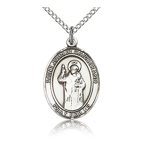 Die struck, hand-engraved medal. Inscription: SAINT JOHN of CAPISTRANO PRAY FOR US. Free 18-inch sterling silver lite curb chain with lobster clasp. Dimensions: 3/4in x 1/2in. This item is the size of a penny. Made in USA.