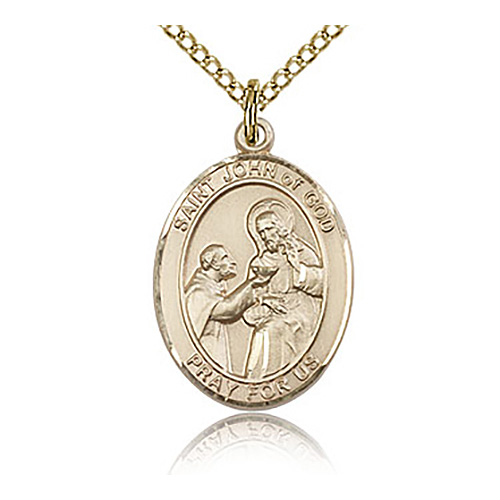 Saint John of God die struck, hand-engraved medal. Inscription: SAINT JOHN of GOD PRAY FOR US. 18-inch gold-plated sterling silver lite curb chain with lobster clasp. Dimensions: 3/4in x 1/2in. This item is the size of a penny. Made in USA.