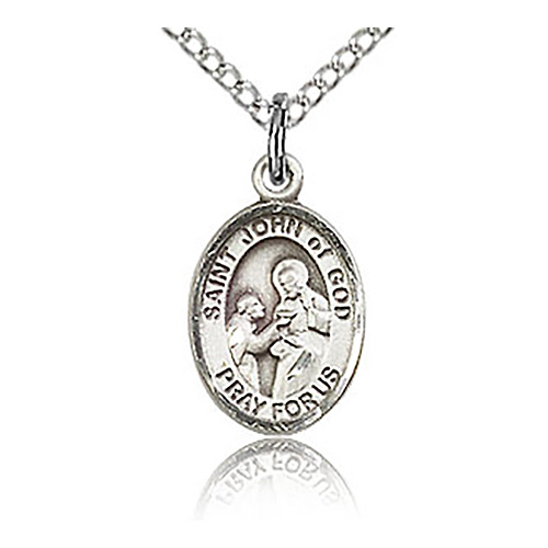 This very small St John of God charm is made of sterling silver. 18-inch sterling silver lite curb chain with lobster clasp. Plain back. Dimensions: 1/2in x 1/4in. This item is half the size of a quarter. Die struck, hand-engraved. Made in USA.